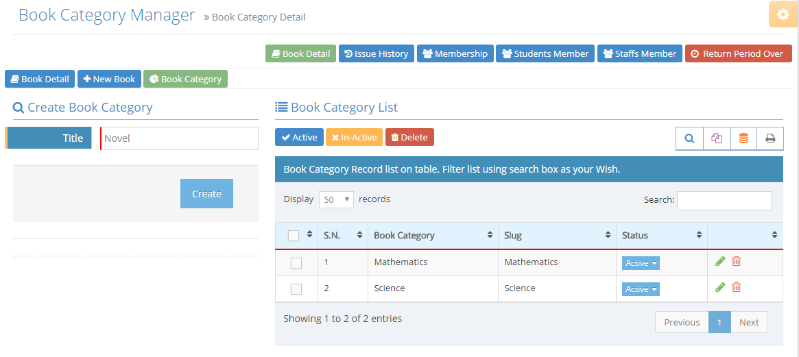 You can edit/delete categories display on Book Category List table.