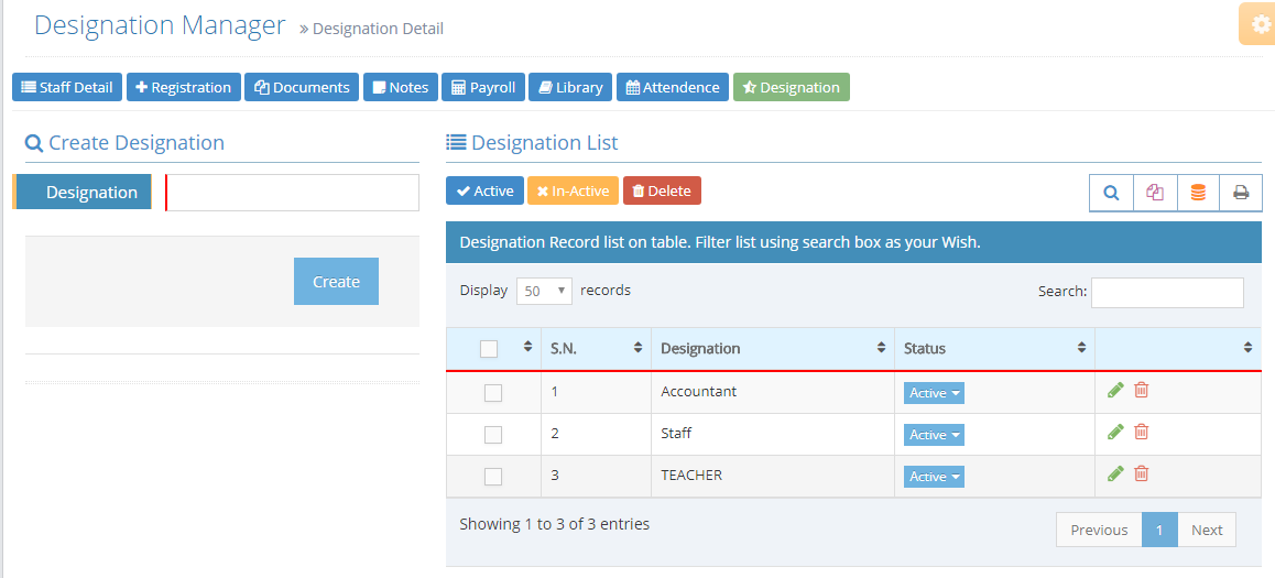 You can Edit,Active,Inactive or Delete Designation from Designation List Table.