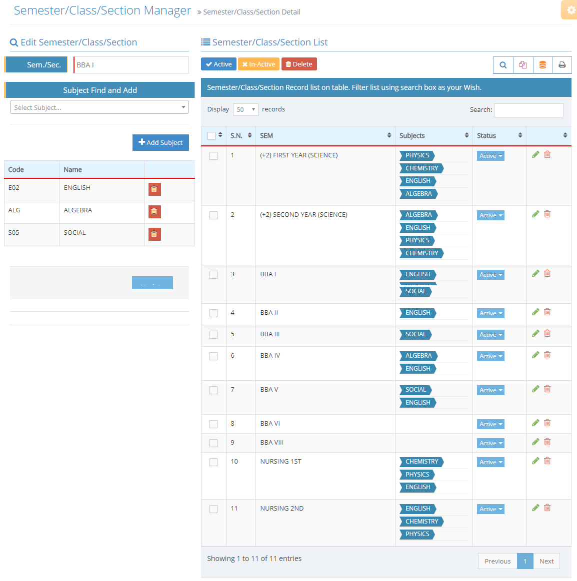 Input Semester or Section Title (college semester - BBA I, class section - Class 1 A, Class 2 A